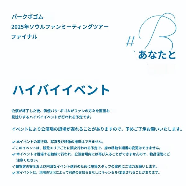 WITH YOU HI-BYEVENT(ハイバイイベント)=お見送りイベント公演が終了した後、パク·ボゴム俳優がファンの方々を直接お見送りするハイバイイベントが行われる予定です。 イベントにより公演場の退場が遅れることがありますので、予めご了承お願いいたします。