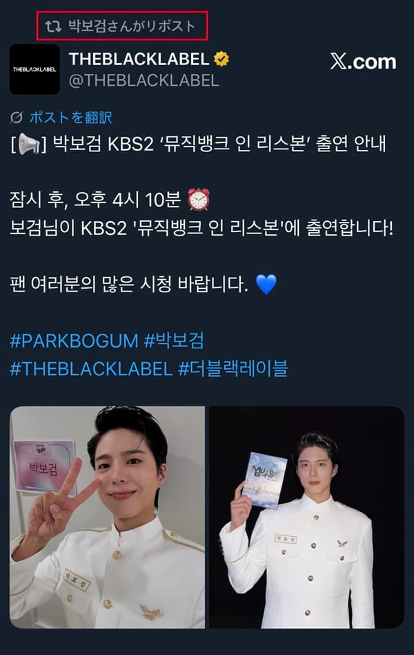 보검님이 KBS2 ‘뮤직뱅크 인 리스본’에 출연합니다!팬 여러분의 많은 시청 바랍니다. 💙#PARKBOGUM #박보검#THEBLACKLABEL #더블랙레이블 pic.twitter.com/iVL5BlqjU7