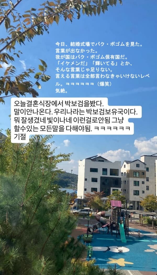 ㅇㅇ(223.38) パク・ボゴム保有国、ばんざいばんざいばんざいww 10.25 16:24:57ㅇㅇ(118.235) 早朝ランニングで10キロ走って、さらに結婚式のゲスト出席まで。ほんと勤勉さの極みだ。 10.25 16:25:28