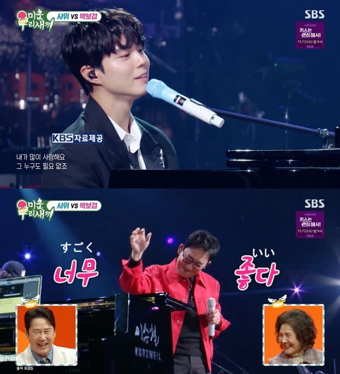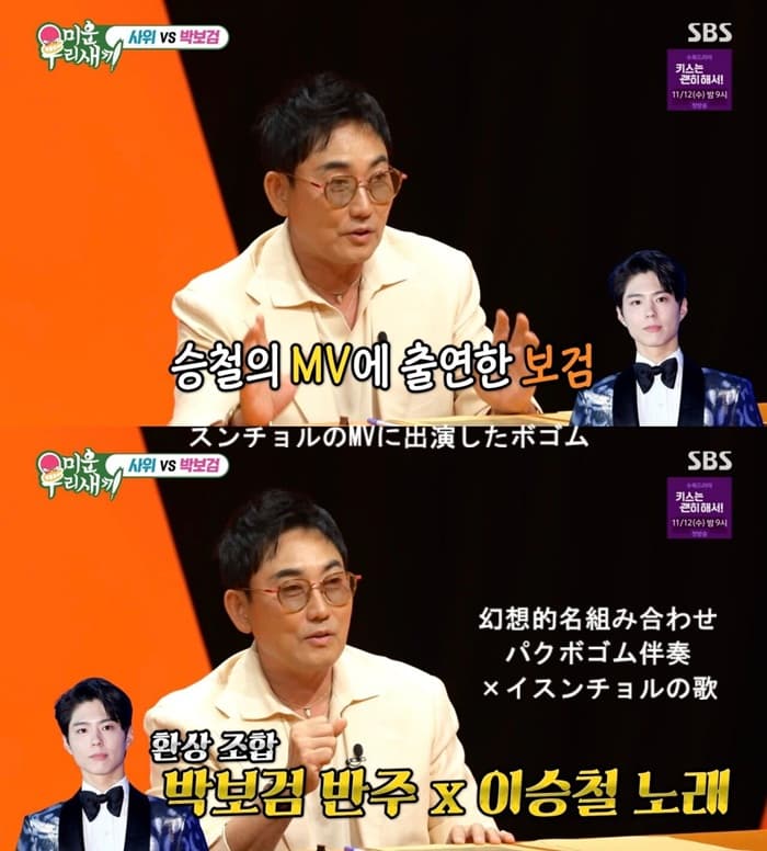これに対しイ·スンチョルは「パク·ボゴムが私のMVに出演した。 撮影が終わってお酒一杯を一緒にしたが、ピアノが上手だと言っていた。 それで、その話を聞いて「君がピアノ伴奏をして私が歌を歌えば大当たりだ」と思ったが、実際に放送で共演※して大当たりした」とパク·ボゴムを愛するほかはない理由を説明した。