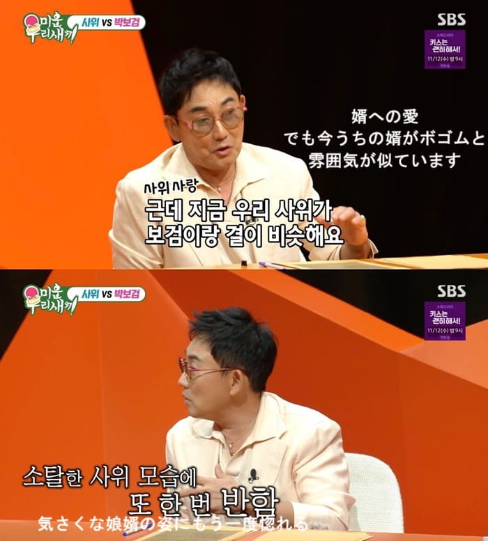 そして、イスンチョルは「パクボゴムが婿候補だった。 ところが、今、(実際の)うちの婿が似ている。 背も高くて心も大人だ。私が婿を一番気に入ったのは、もってる靴が3足だけだった。 そのように素朴で質素だ」と婿への愛情も隠さなかった。