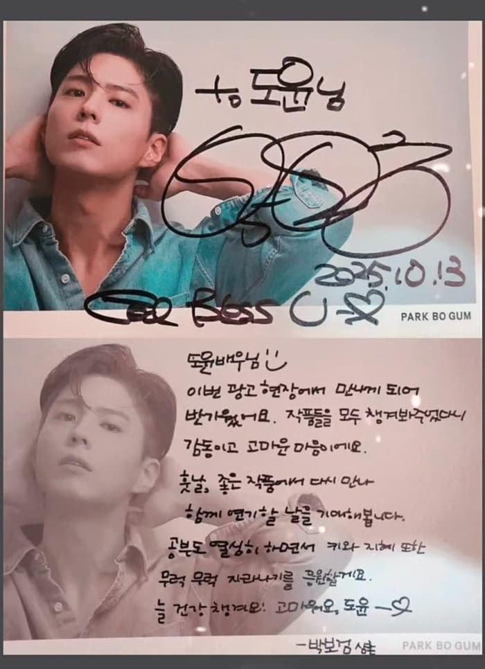 朝から撮影でお疲れのはずなのに、撮影の間ずっと私たちのドユン君のこと思いながら書いてくれたなんて感動です、ありがとうございます しかもサインとメッセージもパク・ダジョン(= 優しいボゴムの愛称)が事前に書いてくれてたんですね 10.28 14:34:28ㅇㅇ(183.104) ほっこり…パクボゴム イケメン 10.28 14:35:12