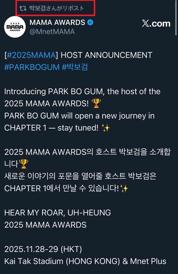 パクボゴム、11/28香港で開催される「2025MAMA」ホストMCで出演決定!(&ボゴミのインスタ投稿もあり♪)