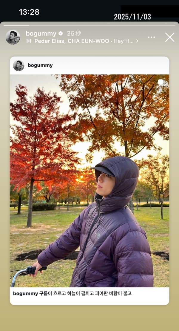 パクボゴム公式インスタ11/3投稿「雲が流れ、空が広がり、青い風が吹く」