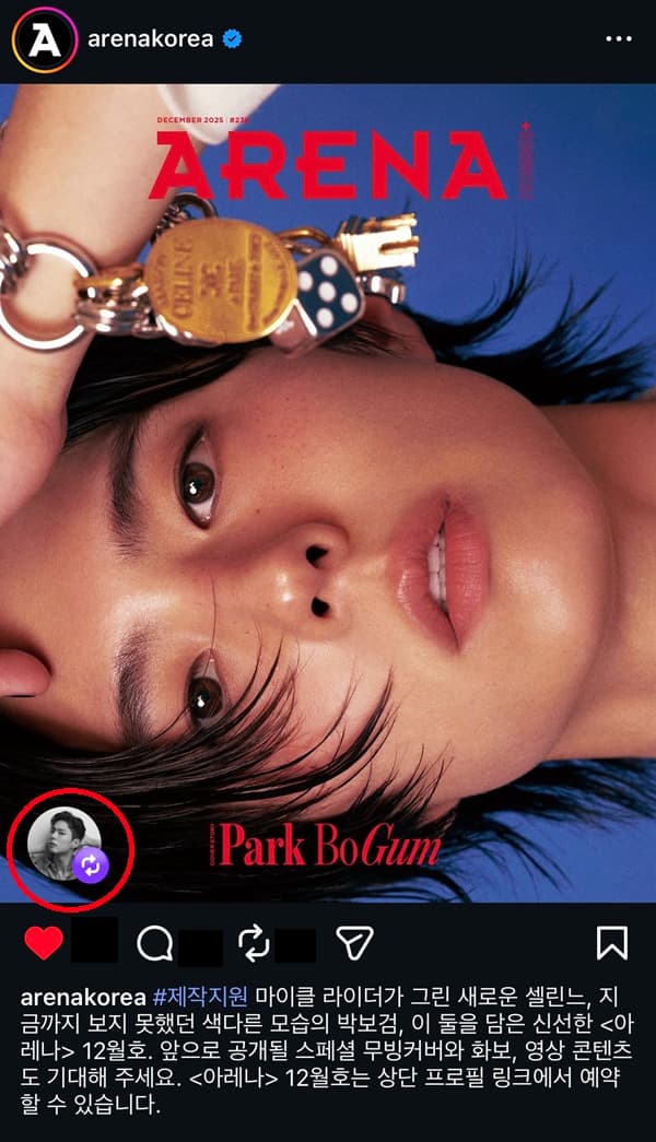 ボゴミがリポストでお知らせ!「ARENA HOMME韓国版12月号」