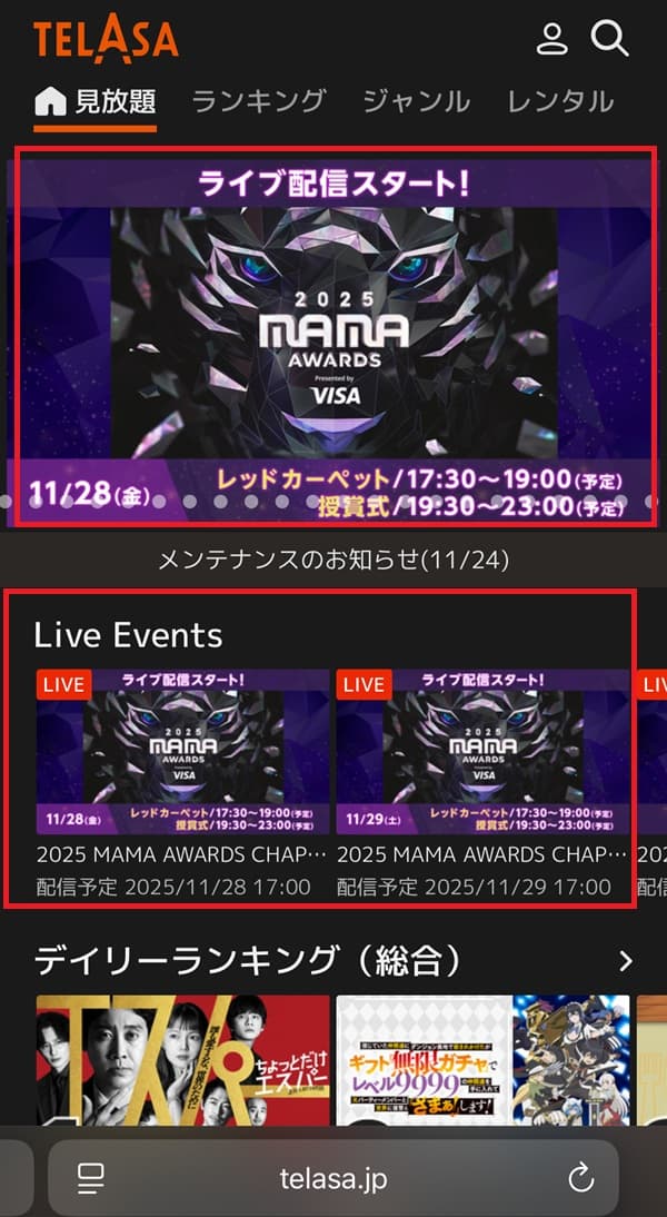 今日のMAMAを見るには「テラサの見放題プラン(月額990円)」に入る必要があるのだけど…