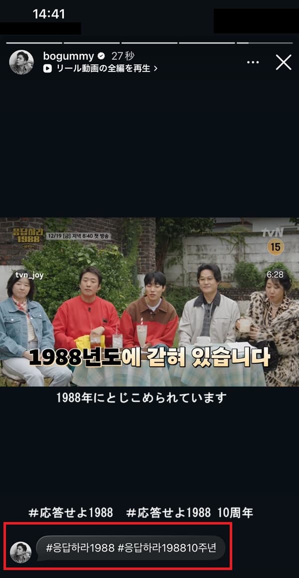 ※上の赤枠内は ボゴミのコメント「#応答せよ1988 #応答せよ1988 10周年」でした^^