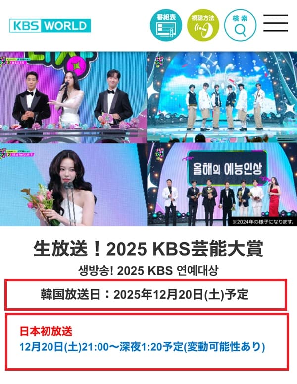 12月20日の「KBS芸能大賞」、日本のKBSワールドでリアルタイム放送!