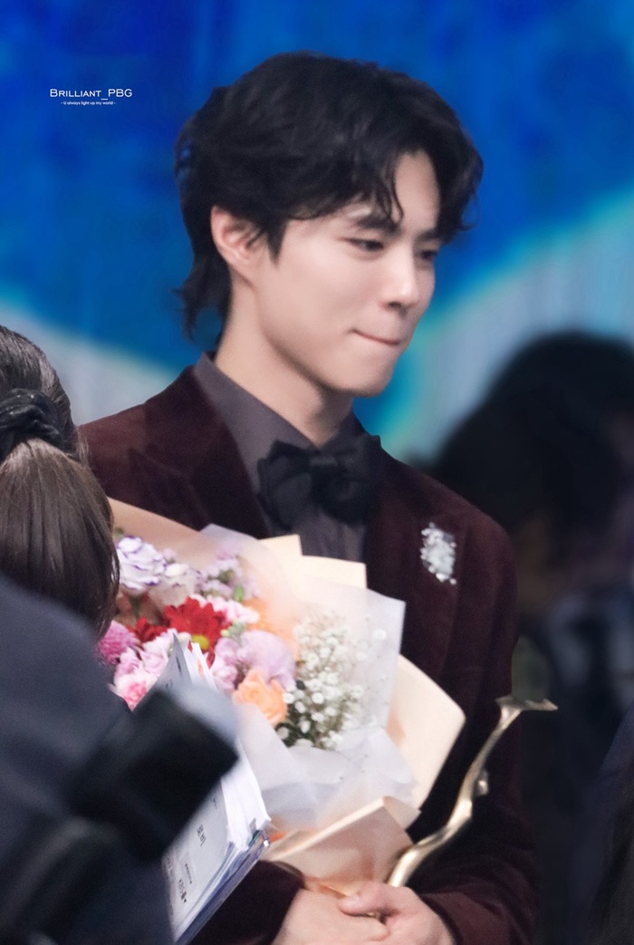 パク・ボゴムは花束とトロフィーを振りながら、ゆったりと踊ってコメントを締めくくり、また一つの名場面を完成させた。