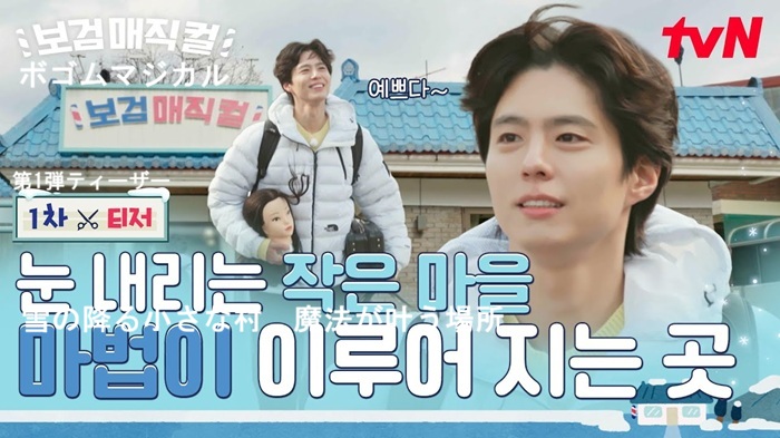 2日に公開された第1弾ティザーには、『ボゴム・マジカル』で、お客さんたちのヘアスタイルを担当するパク・ボゴムが、雪の降る小さな村を力強く歩いて出勤する姿が収められている。