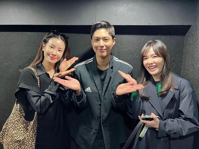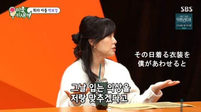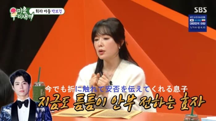 彼女は「制作発表会※の前日に電話が来た。『お母さん、何を着る予定ですか。その日に着る衣装を合わせます』と言われた」とし、「息子役を演じた俳優と衣装を合わせて着たことは一度もなかった」と、気配りに満ちたパク・ボゴムの人柄を称賛した。