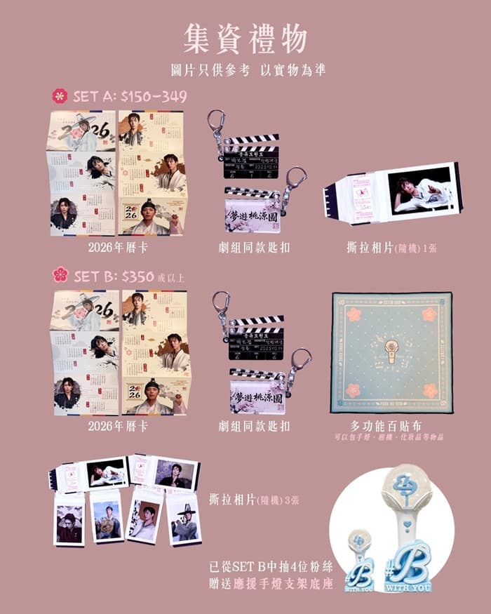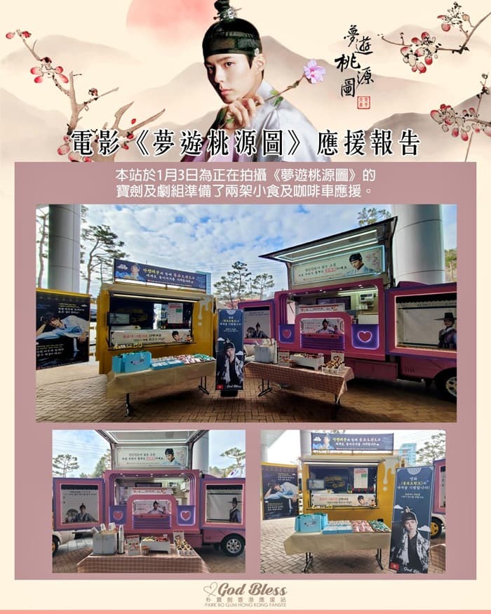本站於1月3日為正在拍攝《夢遊桃源圖》的寶劍及劇組準備了兩架小食及咖啡車應援,融入古風設計了多款橫幅與不同的應援字句。
