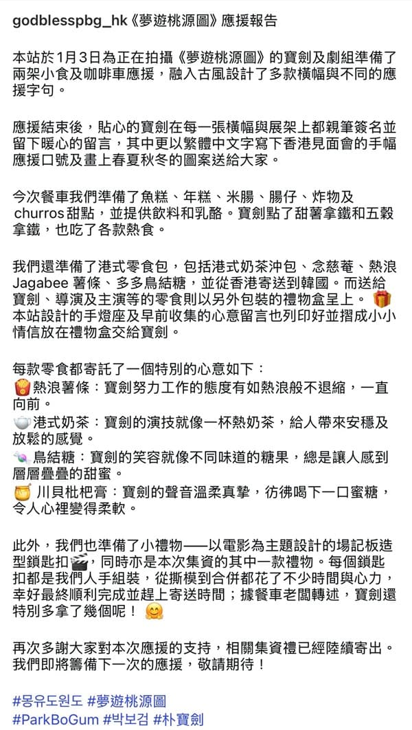 当サイト(=チーム名:ゴッドブレスパクボゴム香港ウエブサイト)は1月3日、映画《夢遊桃源図》を撮影中のボゴムさんおよび制作チームのために、軽食カー2台とコーヒーカーによる応援サポートを行いました。