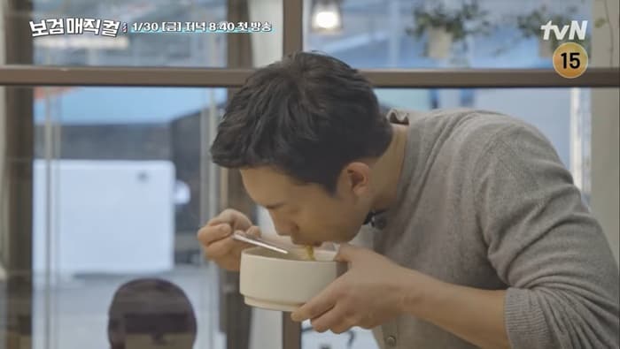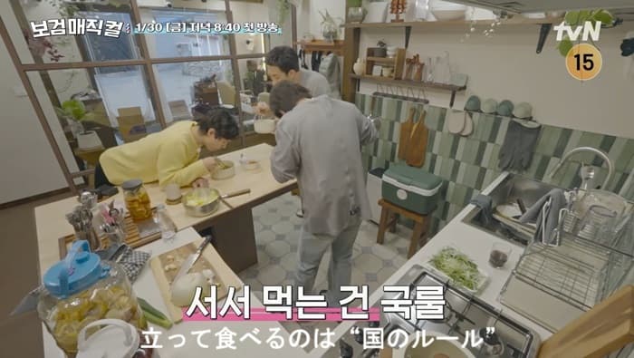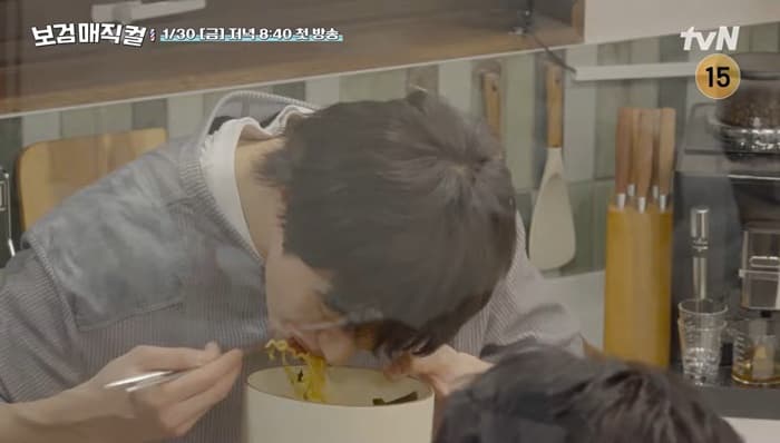 パク・ボゴム、イ・サンイ、クァク・ドンヨンは「先にご飯を食べていいよ」というお客の言葉を受けて、とりあえずラーメンを食べ始めるが、3人とも立ったまま食べていて、切なさを誘う。