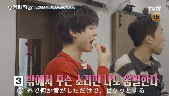 おやつを食べながらも視線は入口に向けたままのパク・ボゴムは、