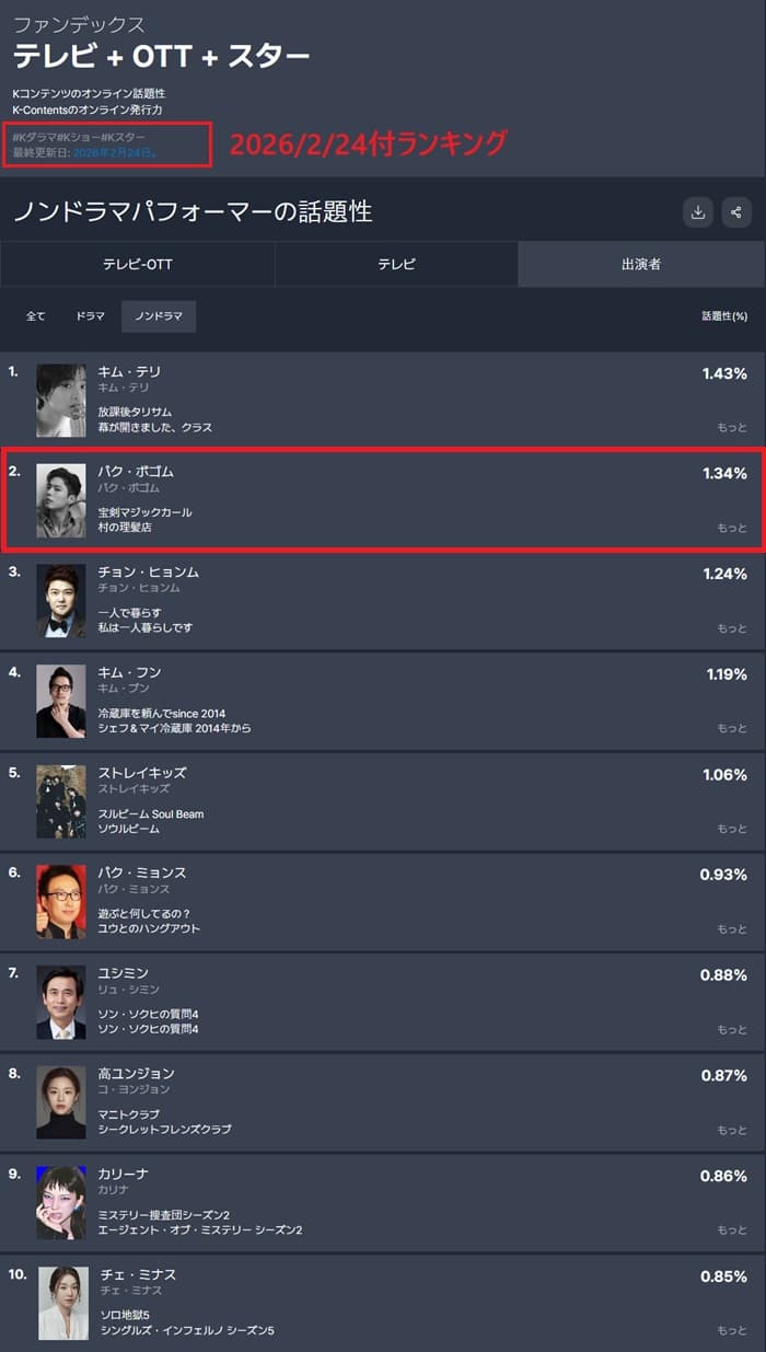 FUNdexの話題性ランキング2/26付け、パクボゴム2位!