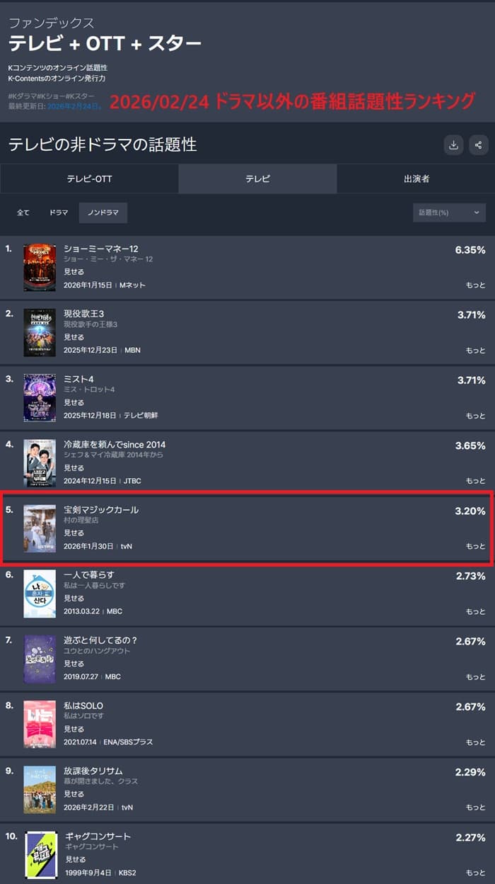 毎週、韓国で放送される番組の話題性ランキングを発表するデータ機関。