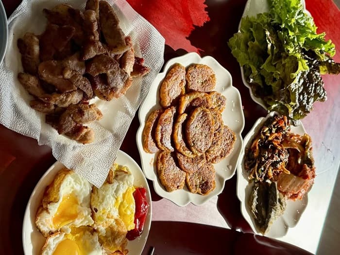 この日のごはんは パクヘジュンさん作(ボゴミが右下の写真に 白い「♡」絵文字を入れてるの見てください)