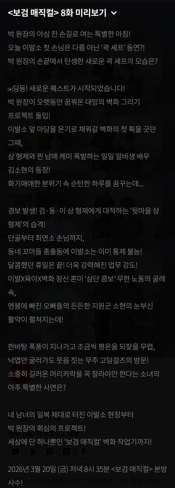 ✔[금] 저녁 8:35 tvN#tvN #보검매직컬#박보검 #이상이 #곽동연 #김소현#즐거움엔20tvN #스트리밍은TVING pic.twitter.com/sKPCVlqze5— tvN joy (@chtvn) March 14, 2026