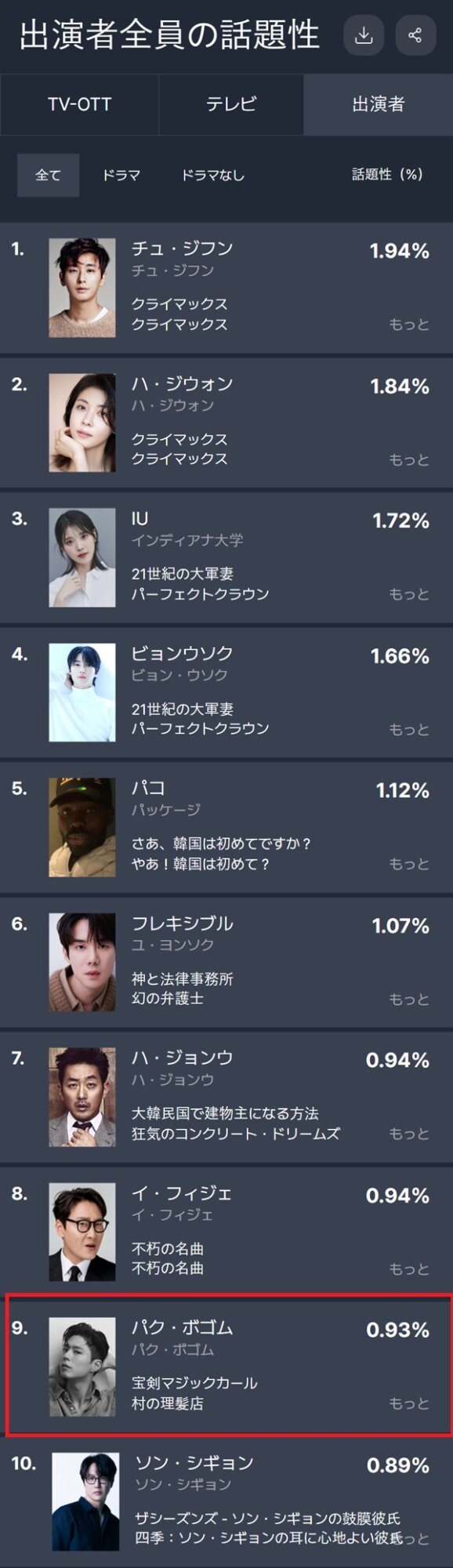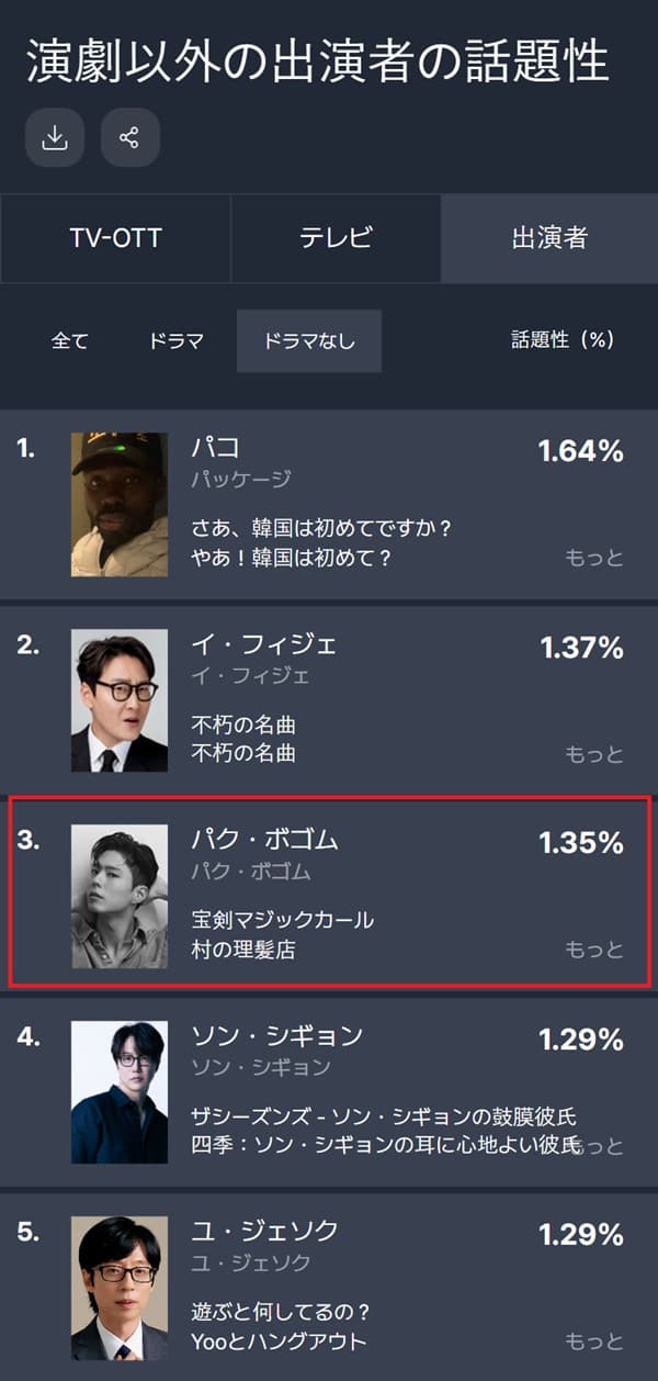 3月第4週目の話題性ランキング|非ドラマ部門3位にパクボゴム!