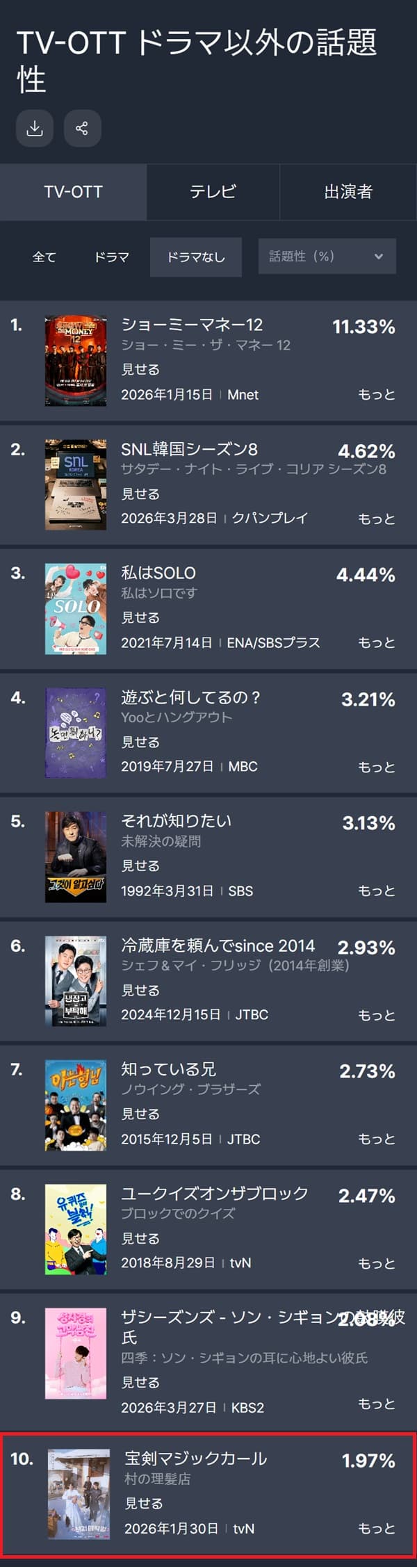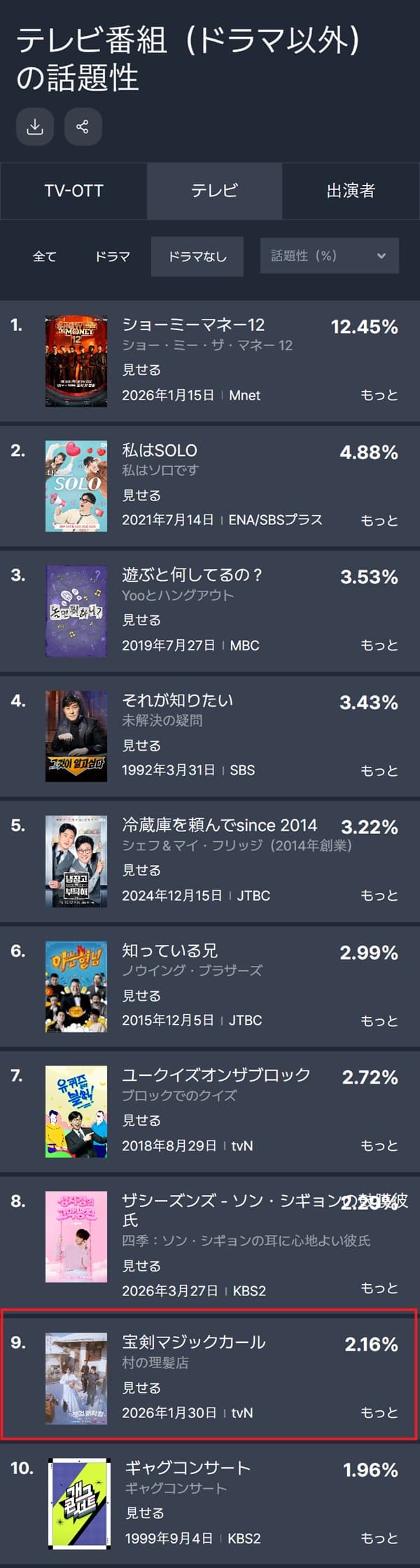 ▶テレビ番組(ドラマ以外)の話題性ランキング