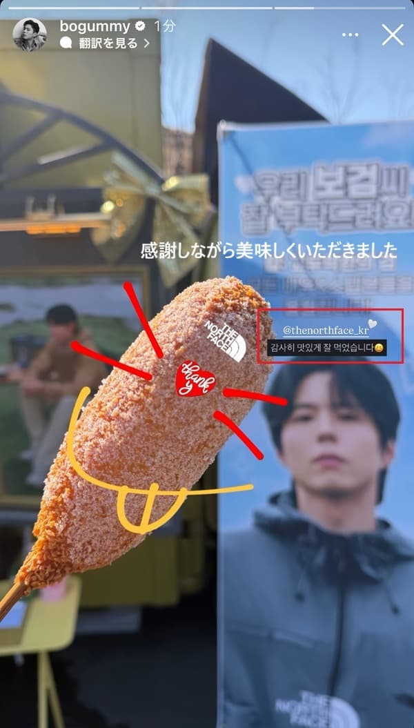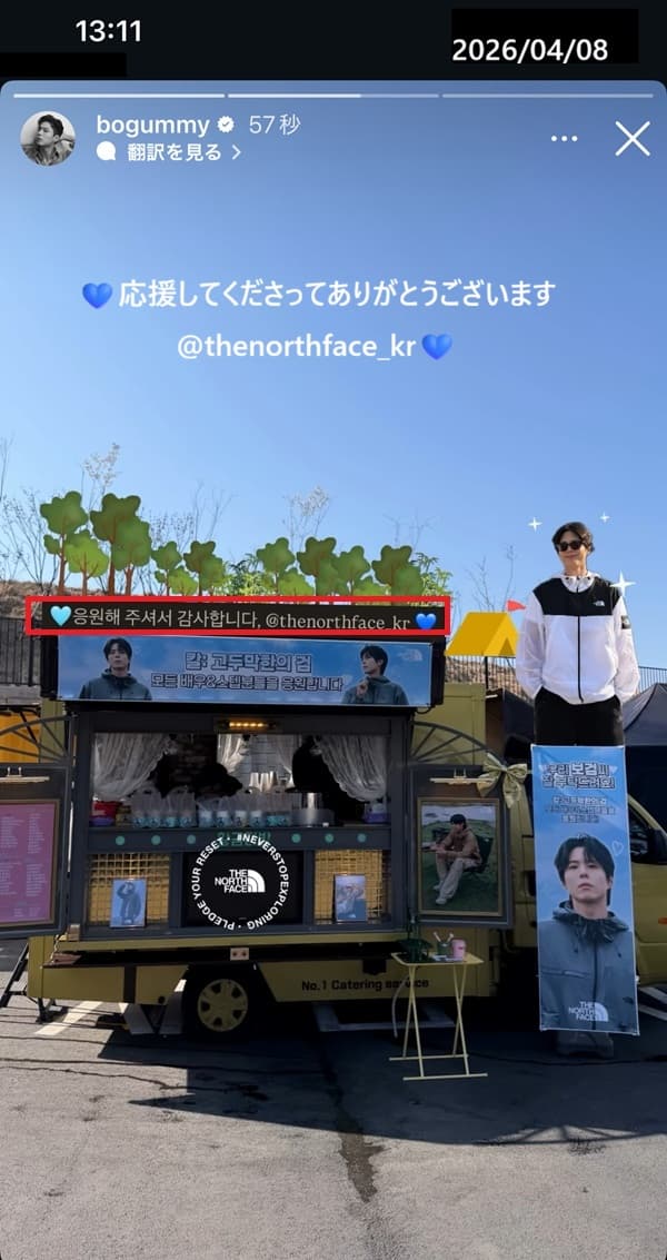 ボゴミがインスタスト-リーで「今日のノースフェイスの応援に感謝」