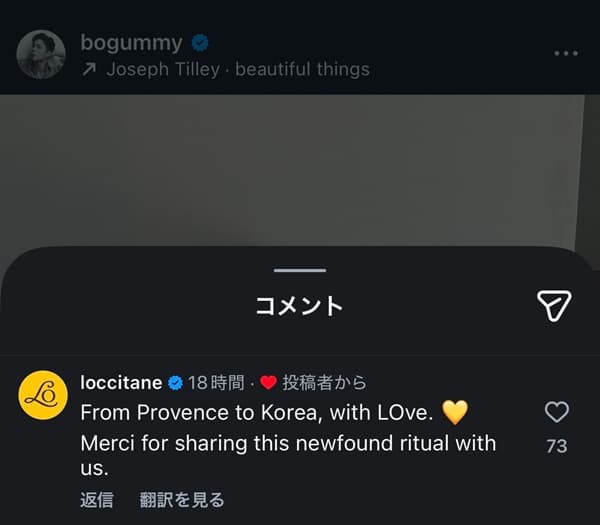 まずは、昨日のボゴミのインスタ投稿に、ロクシタンが返信してた件😅